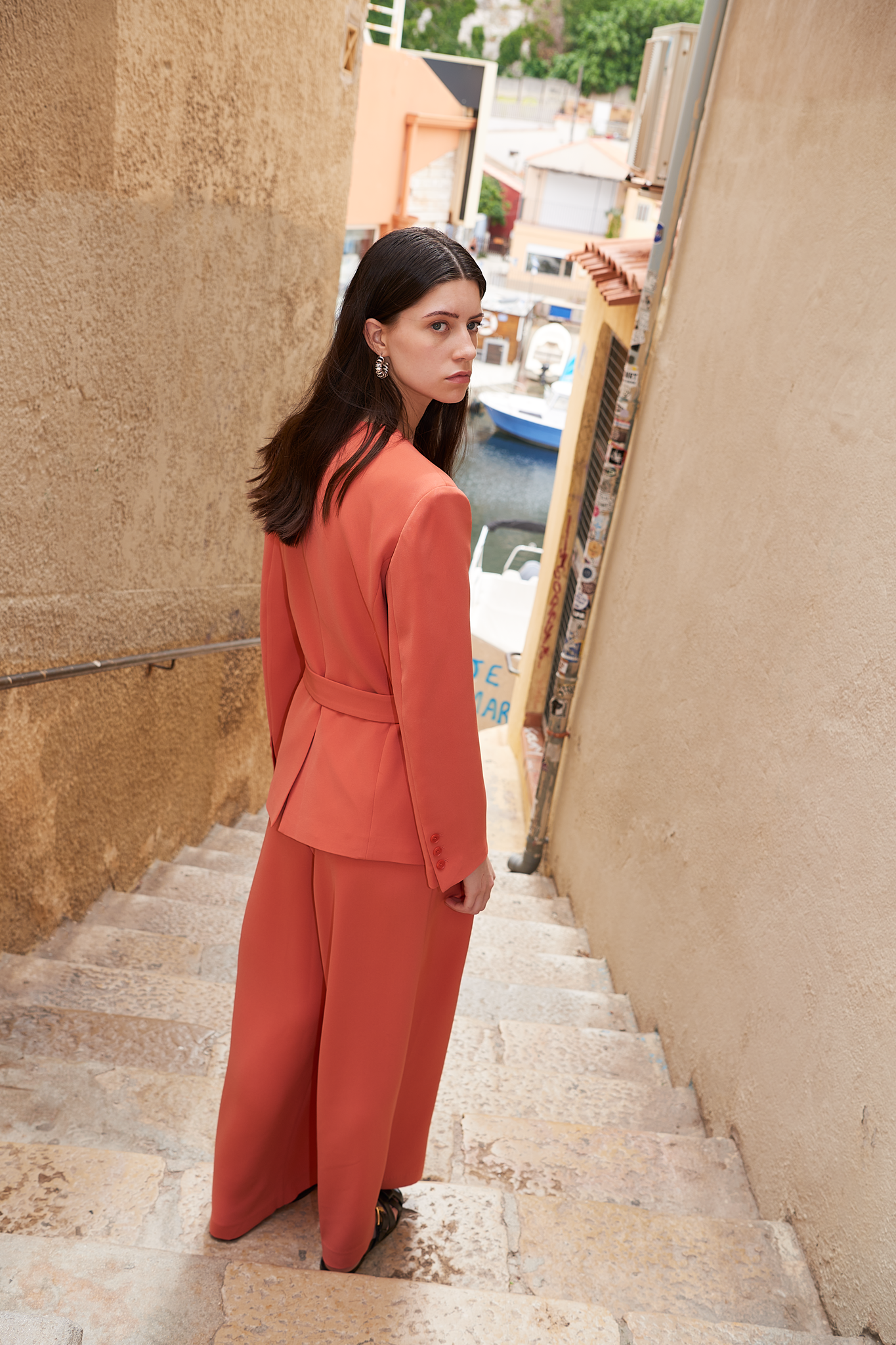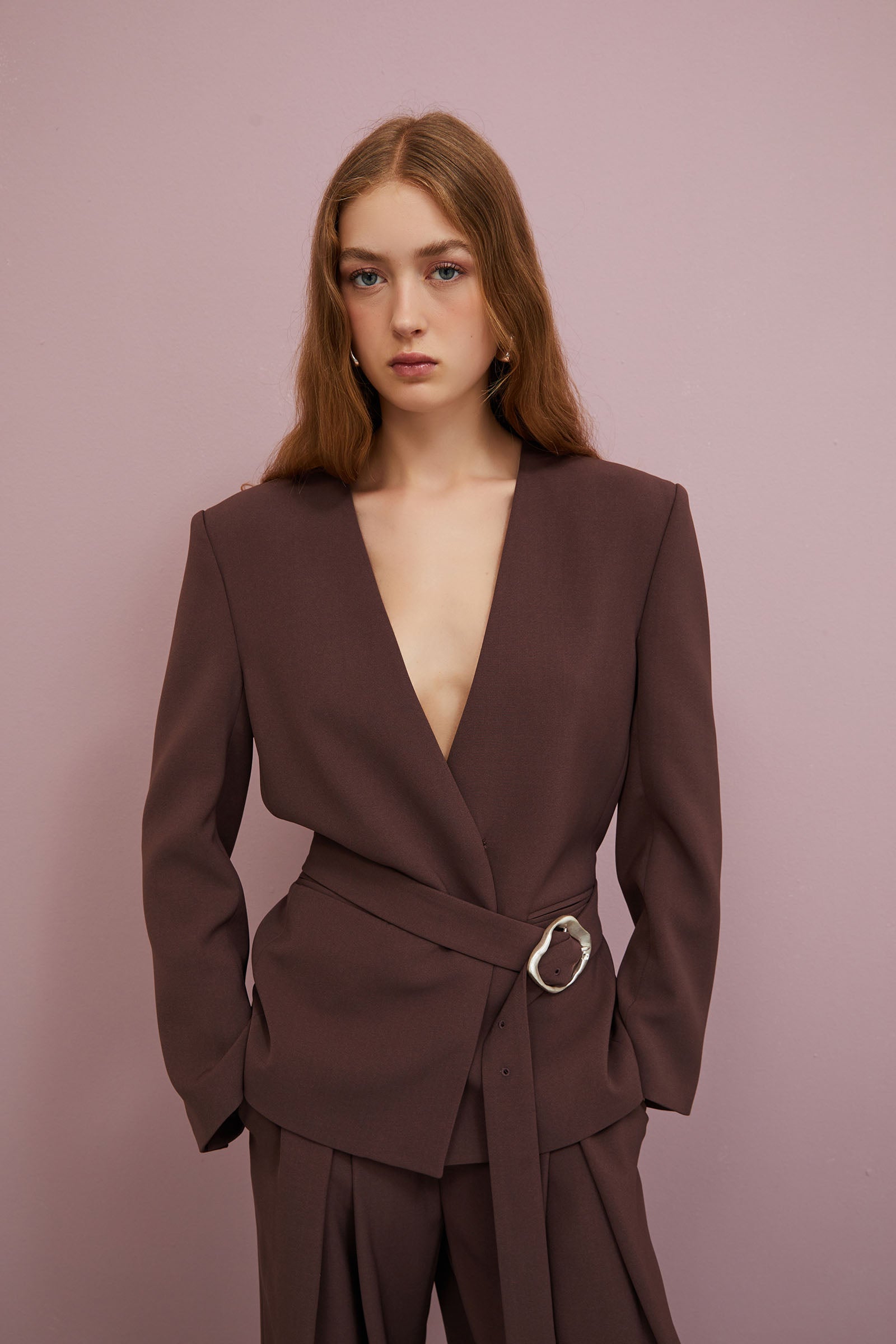 SLIM FIT BLAZER WITHOUT COLLAR WITH BELT AND LARGE BUCKLE .
