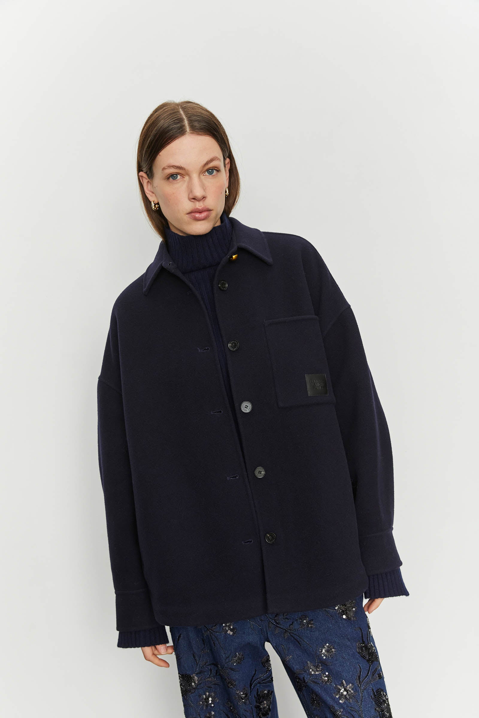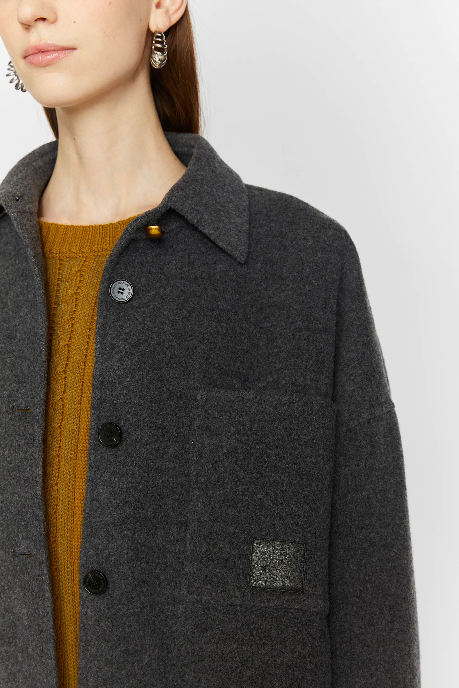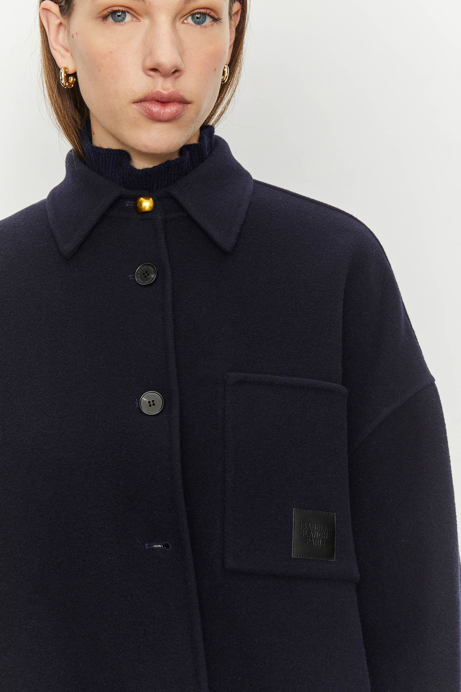 COAT CHEMISIER IN DOUBLE WOOL FABRIC WITH LEATHER PATCHES.