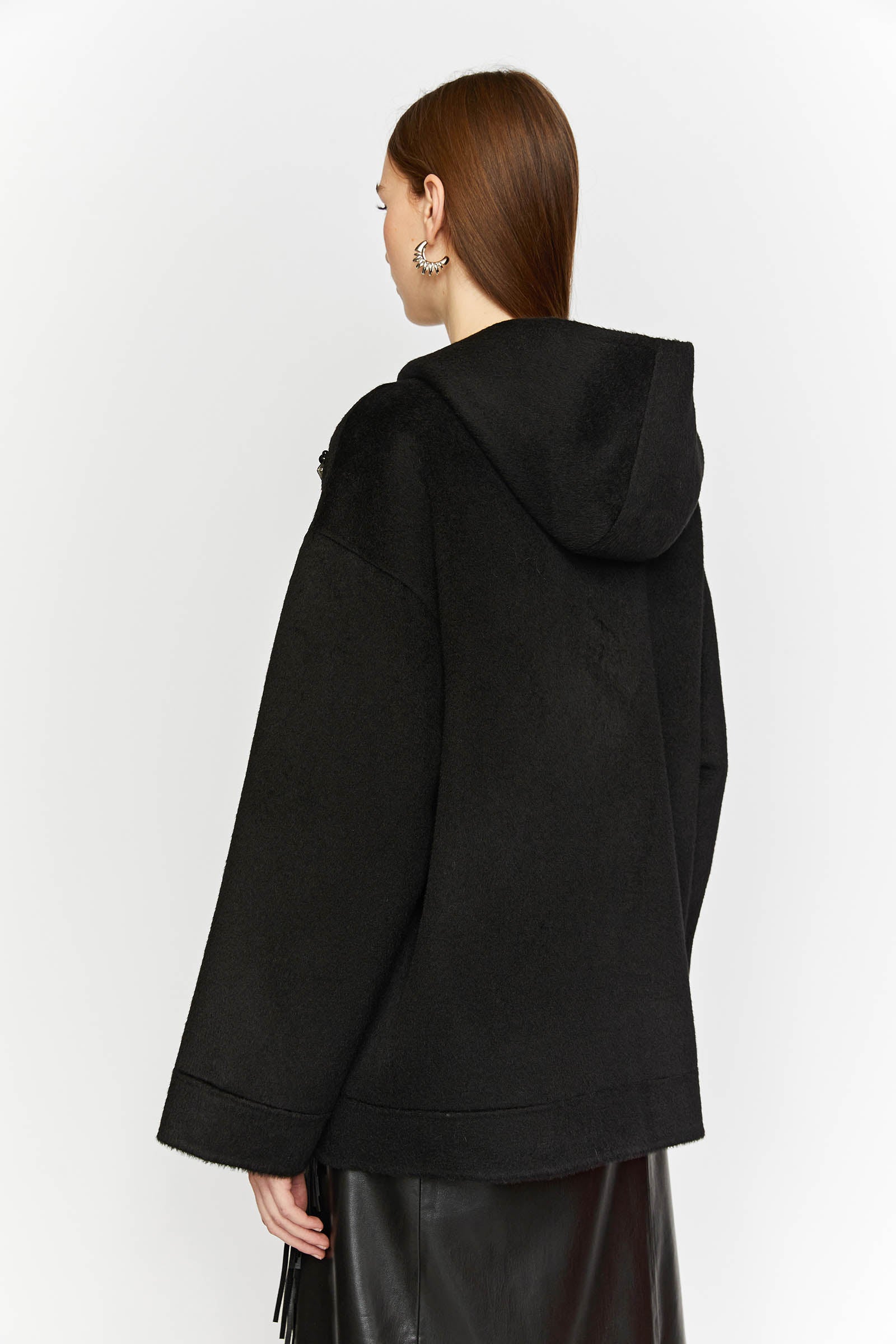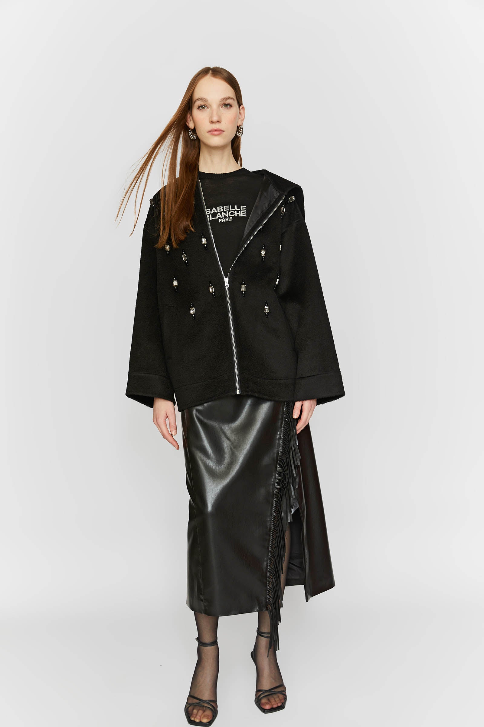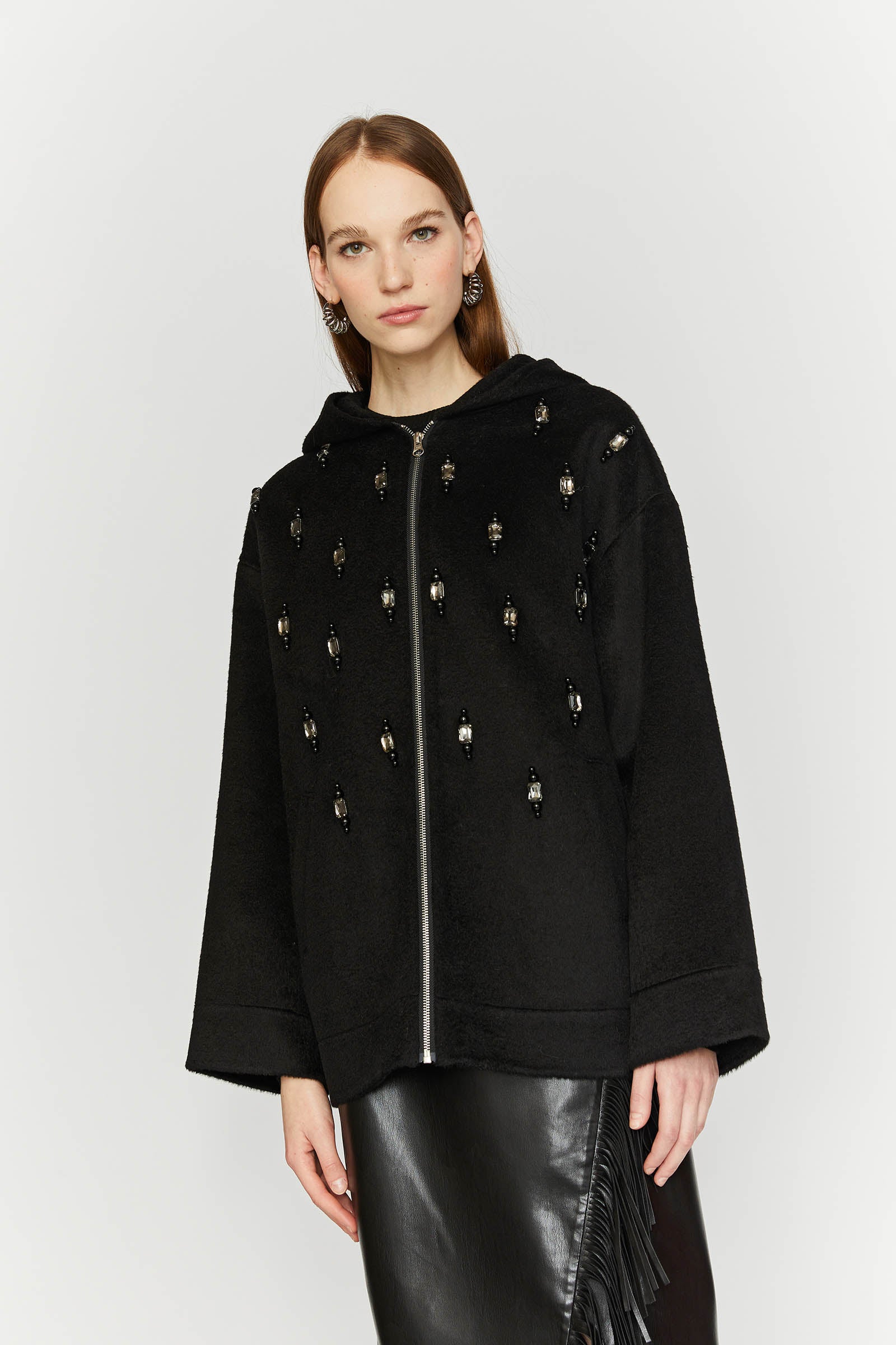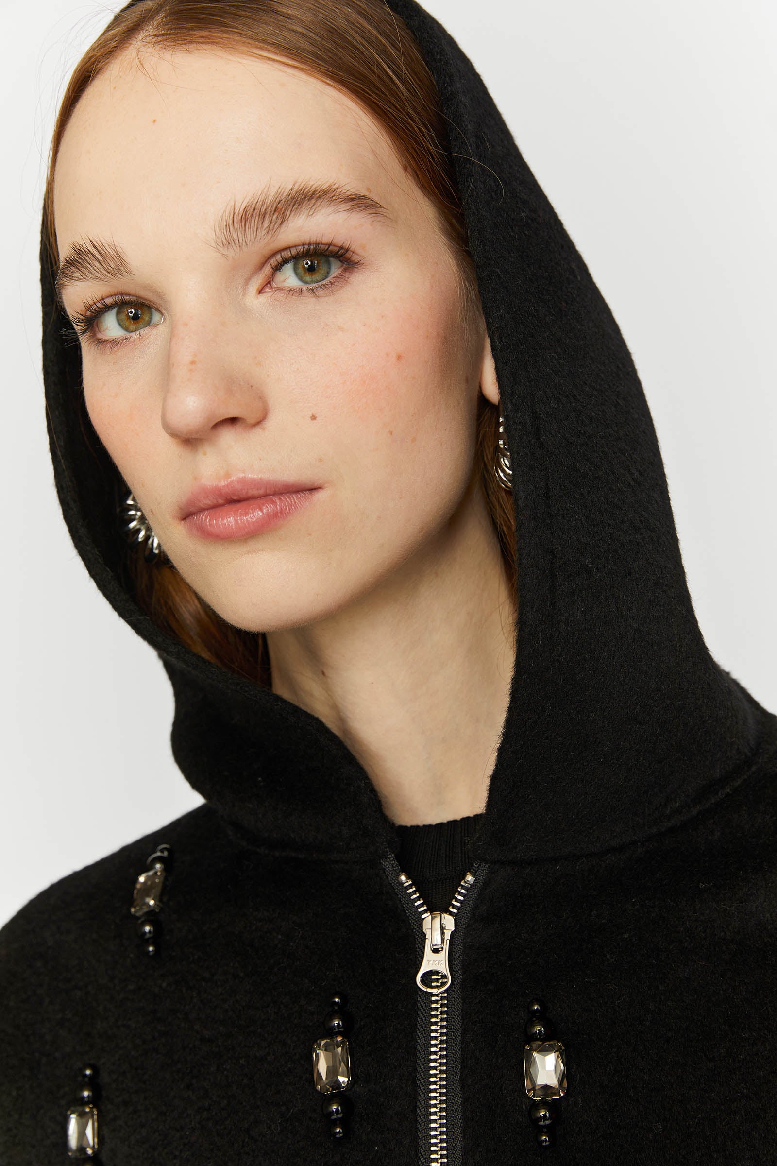 JACKET IN DOUBLE WOOL FABRIC WITH ZIP AND HOOD WITH STONE EMBROIDERY.