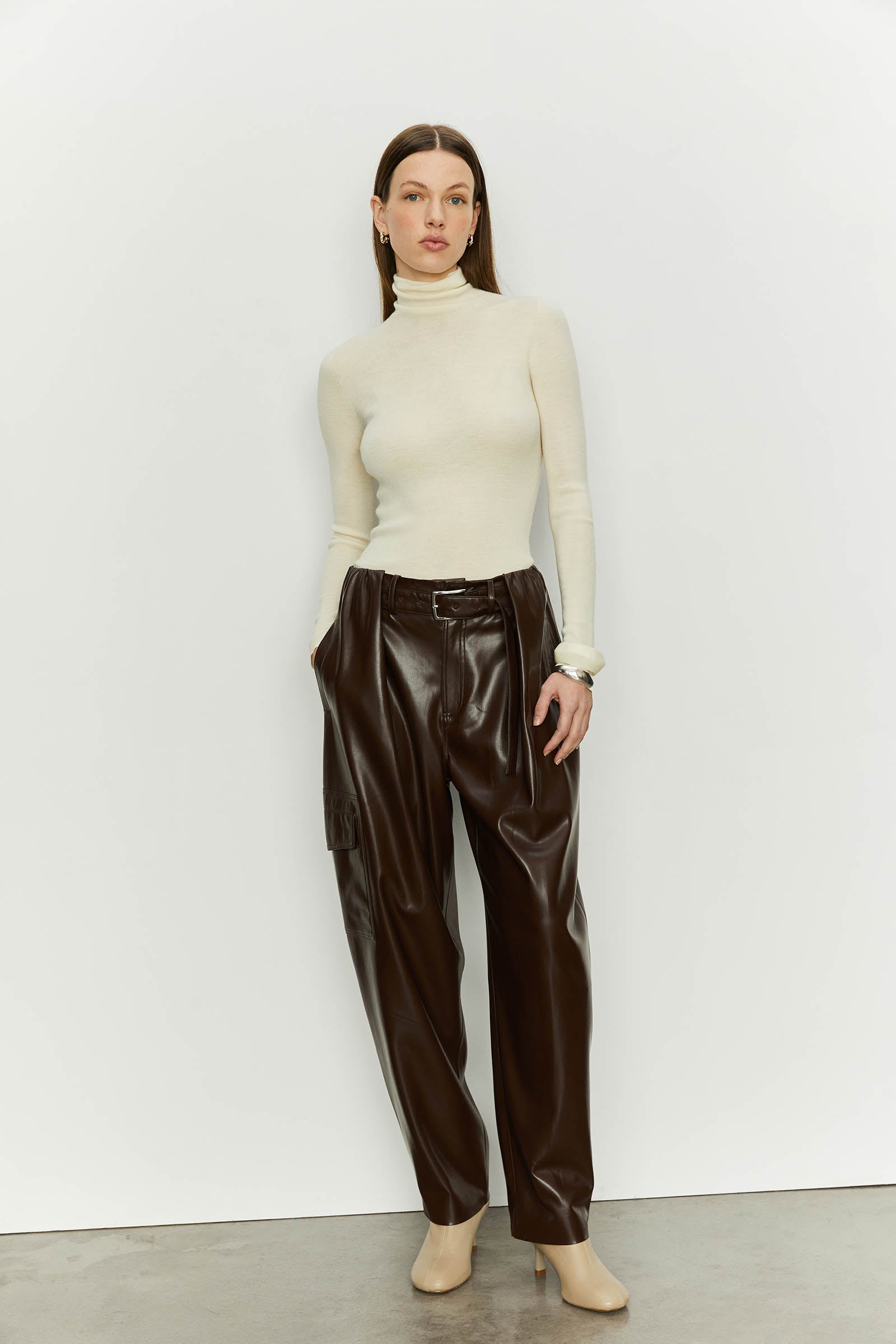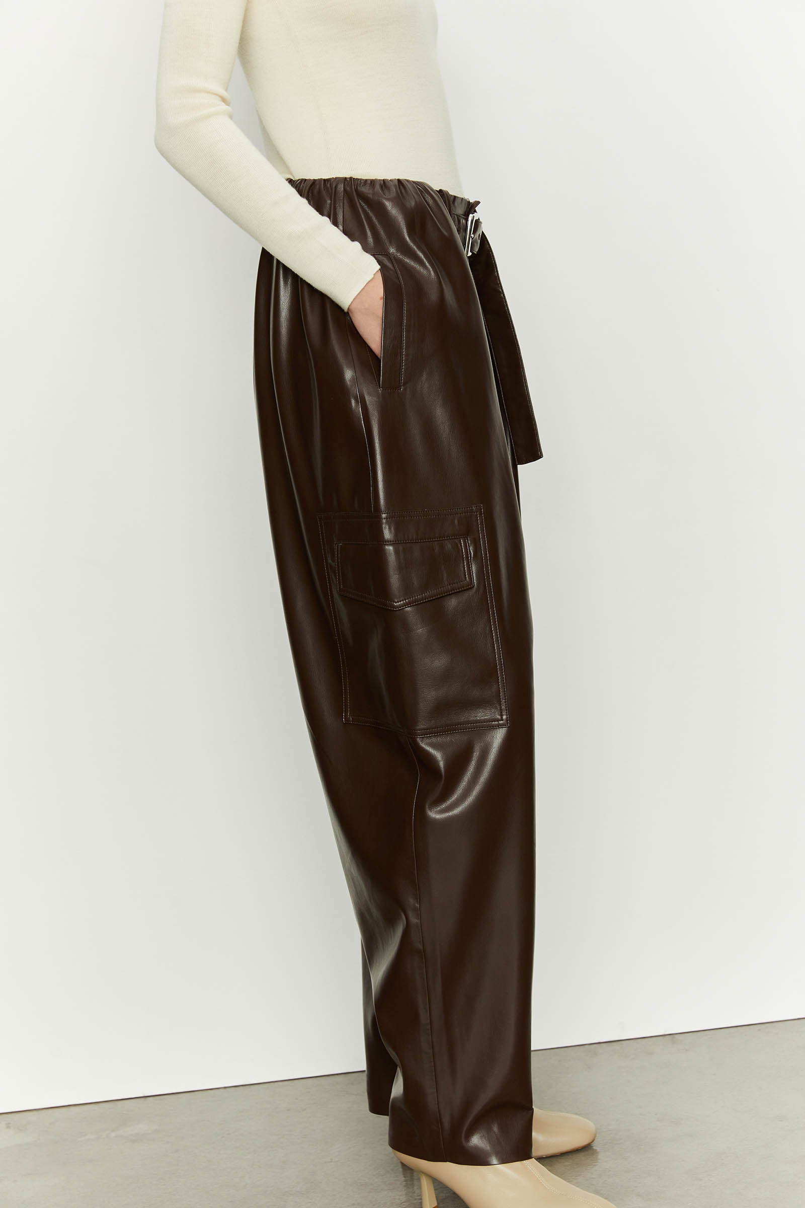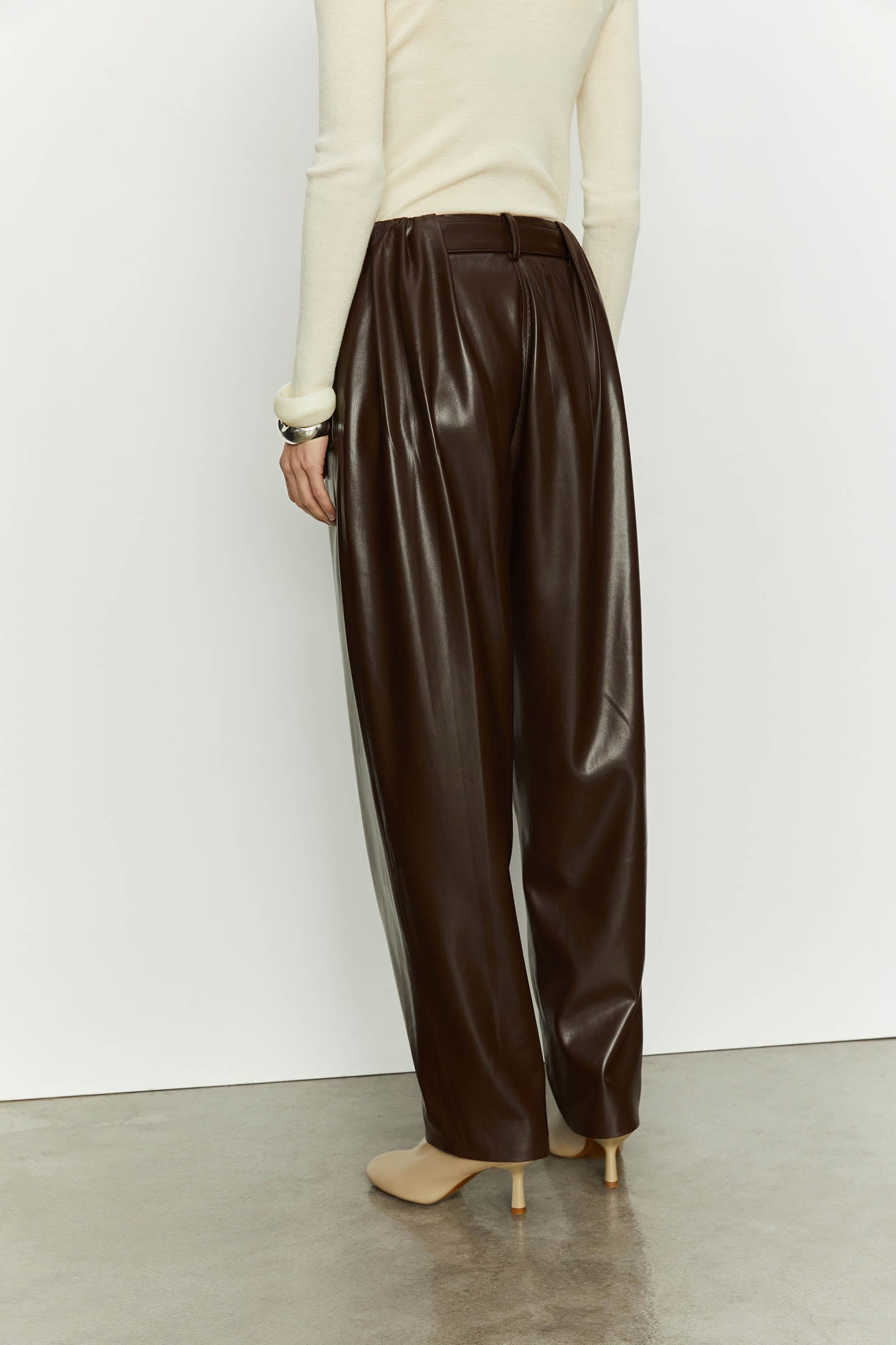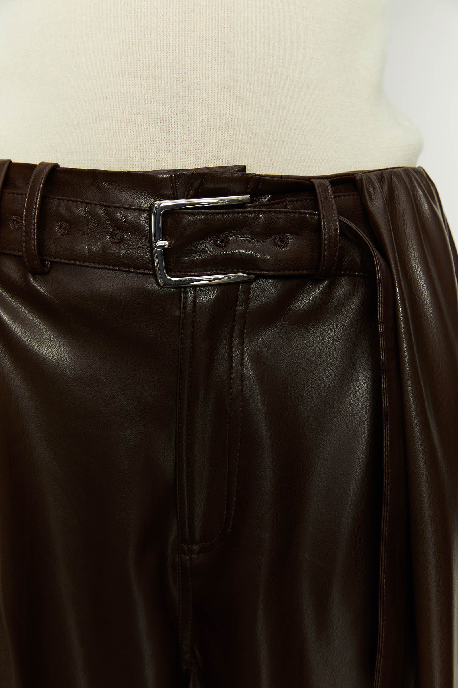 FAUX LEATHER TROUSERS WITH PLEATS AND WAIST BELT.