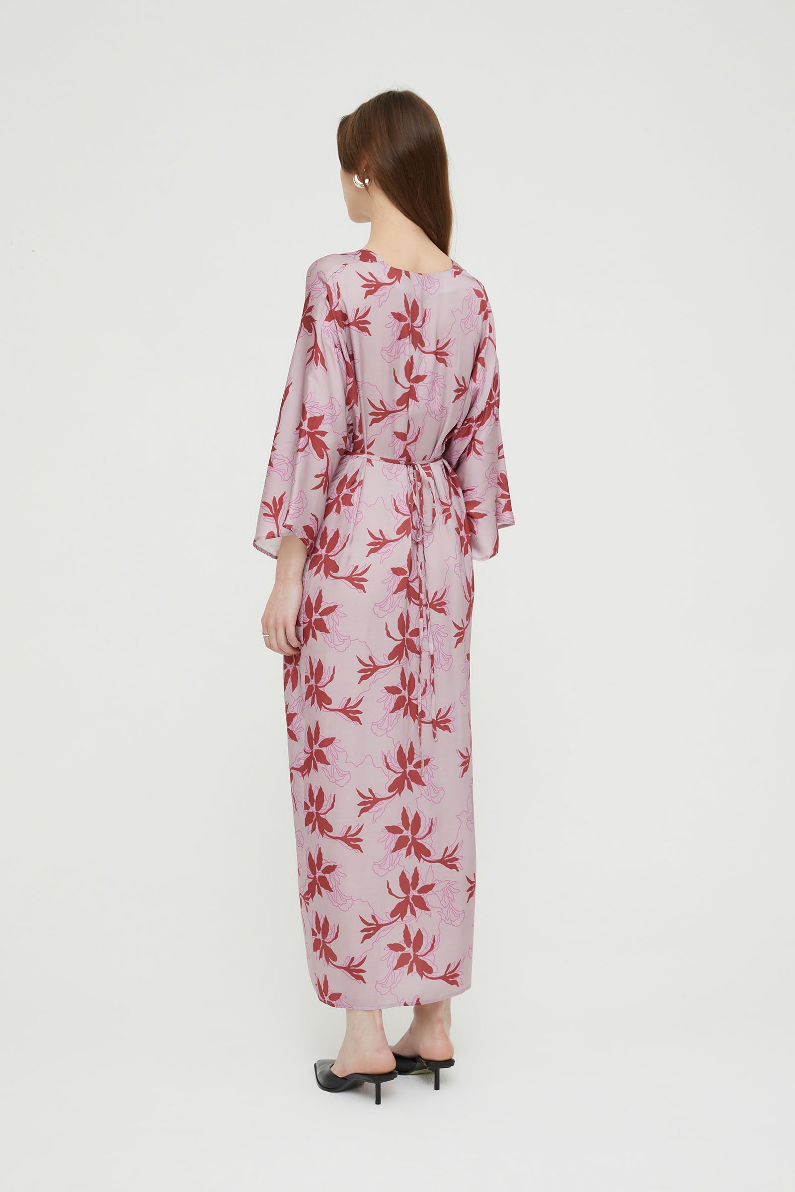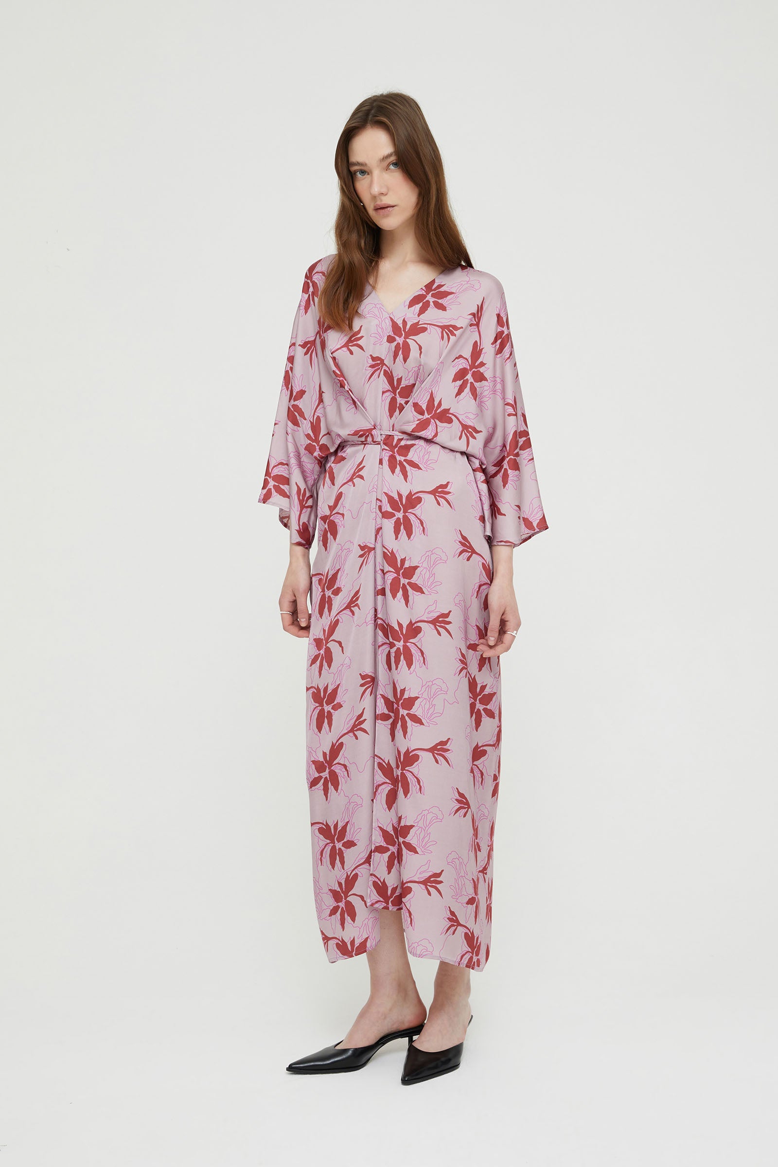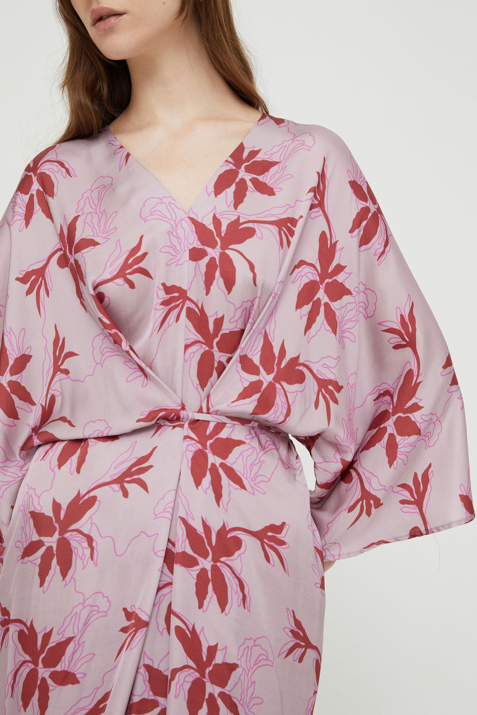 V-NECK DRESS IN VISCOSE SILK SATIN WITH PRINTED PATCHES .