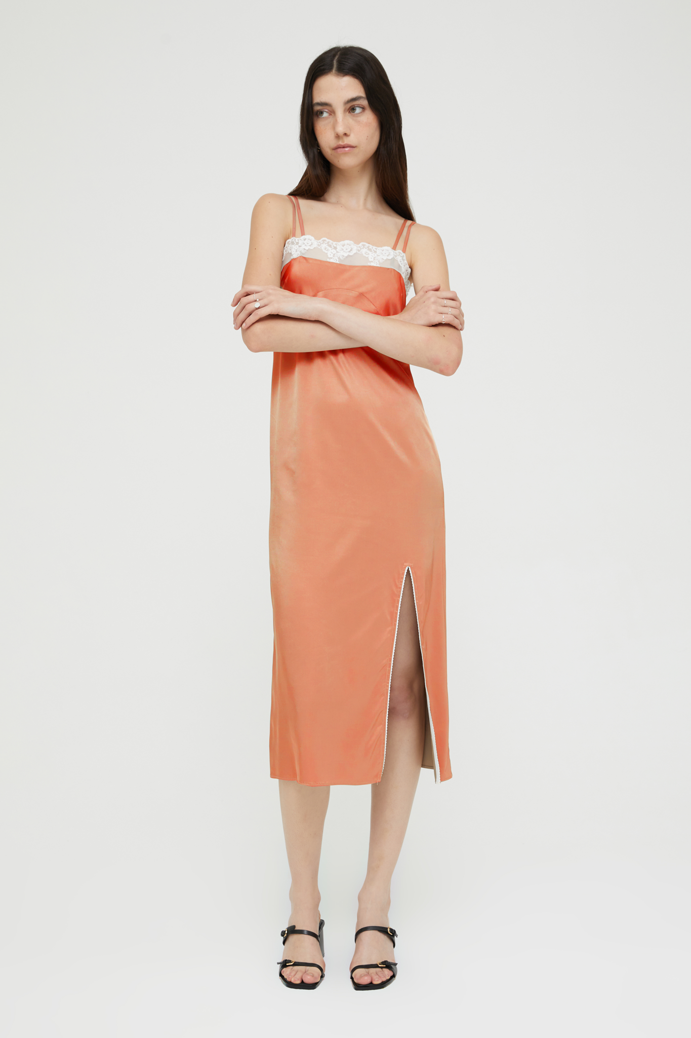 DRESS WITH BRACES IN VISCOSE SATIN WITH LACE INSERT .