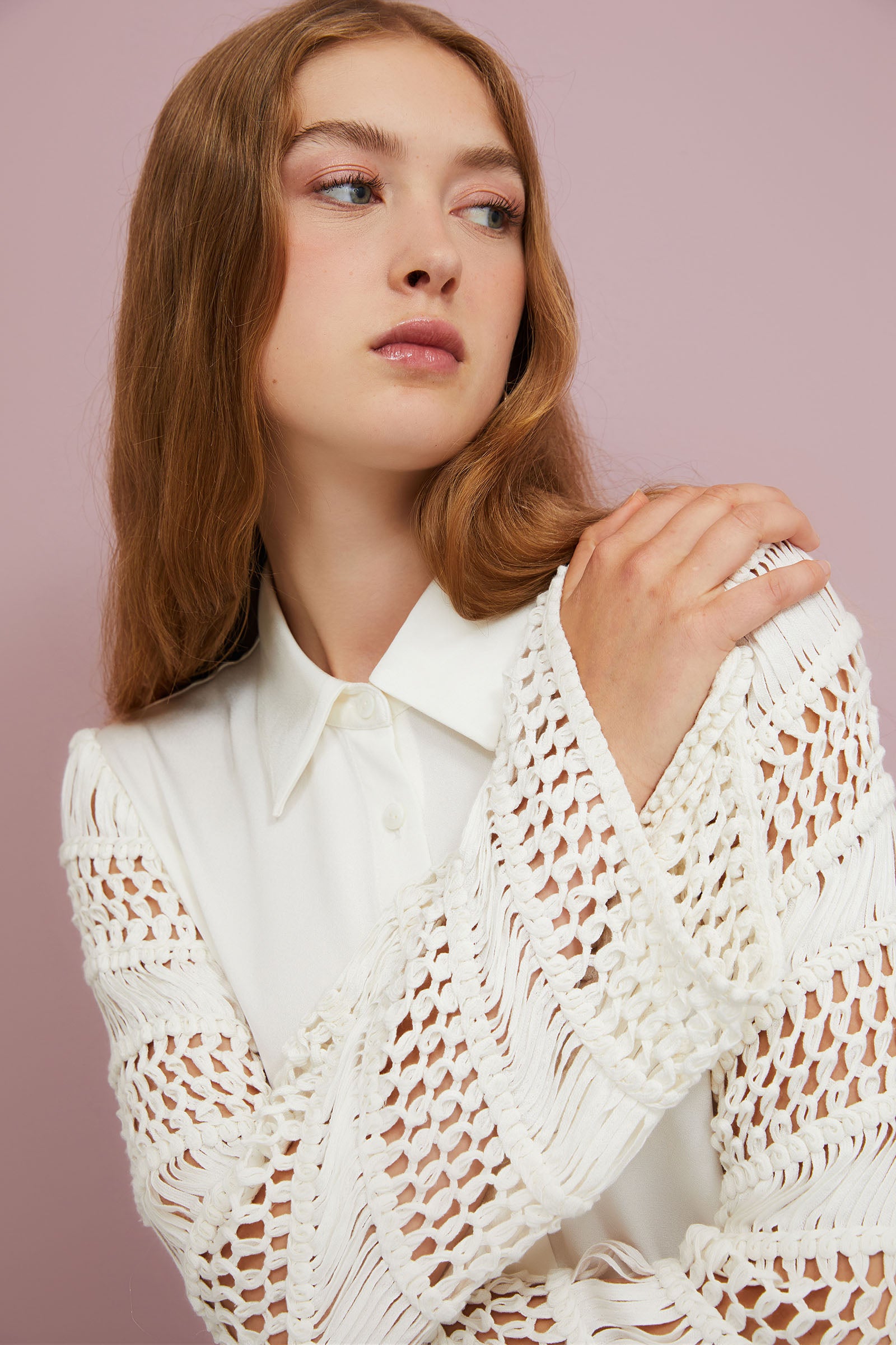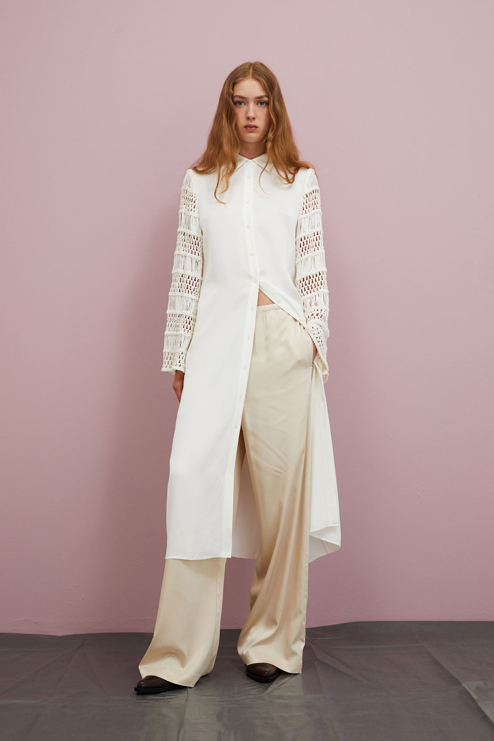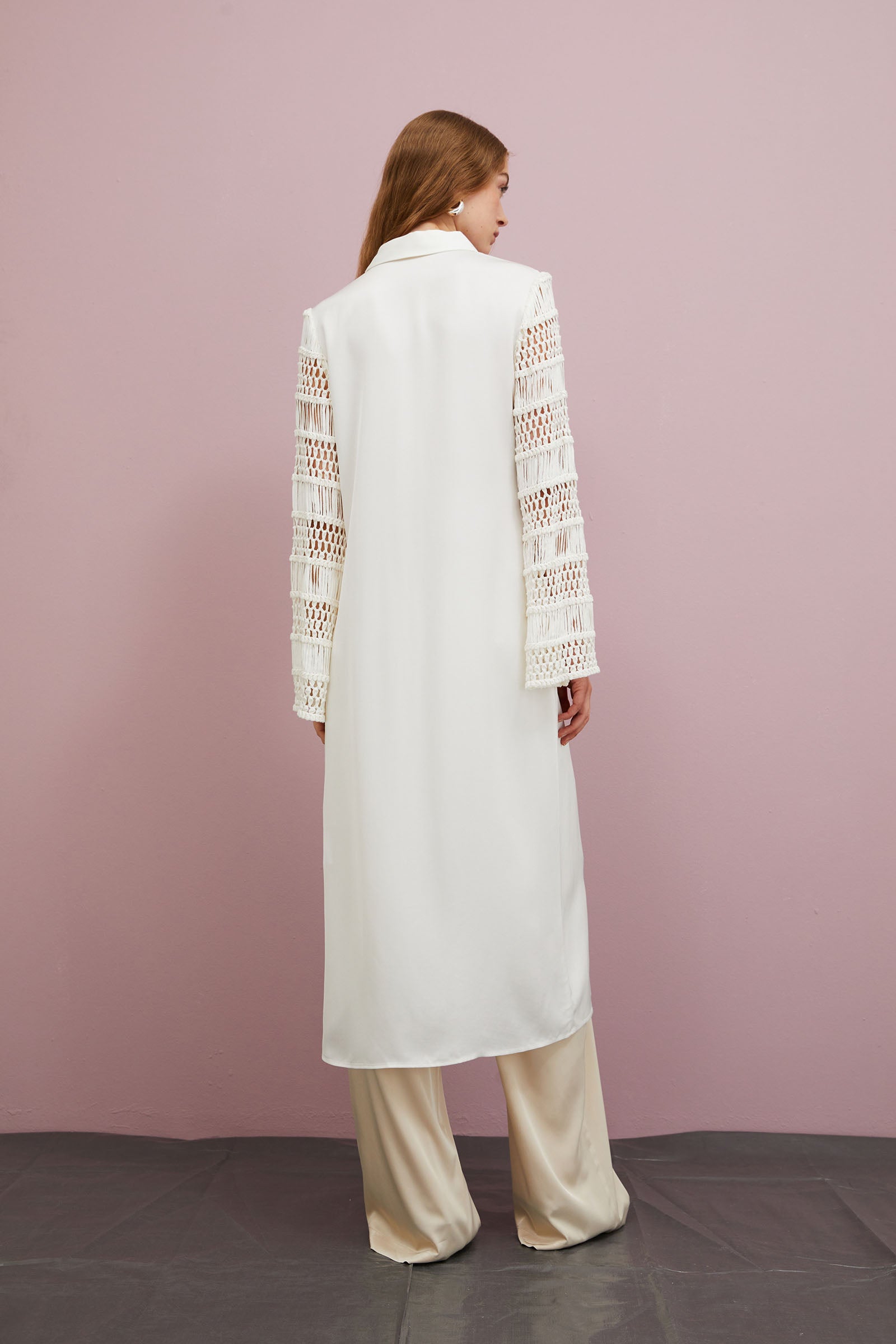 LONG DRESS IN VISCOSE CREPE WITH INSERTS CROCHET SLEEVES .