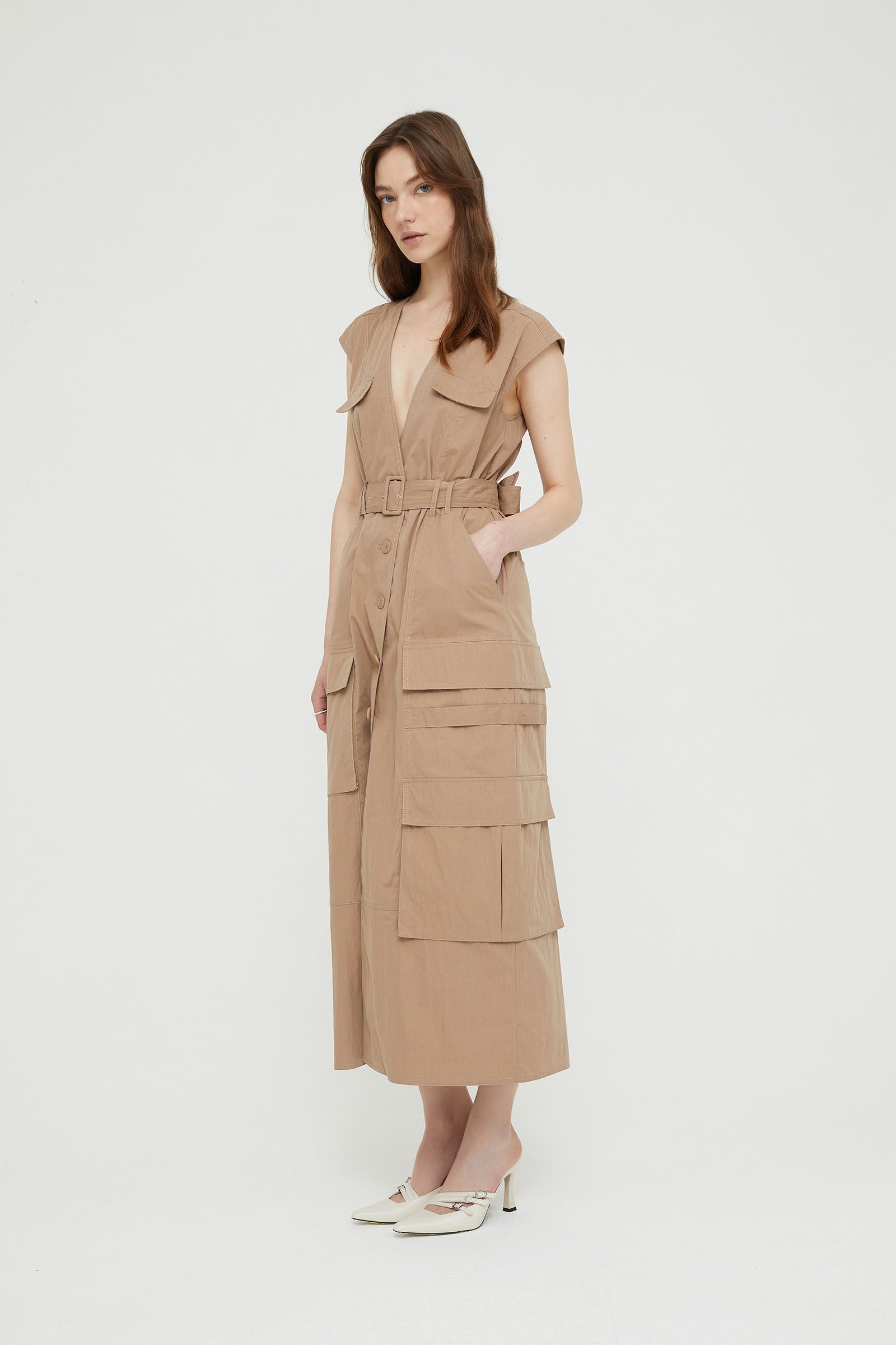 COTTON V-NECK DRESS WITH POCKETS .