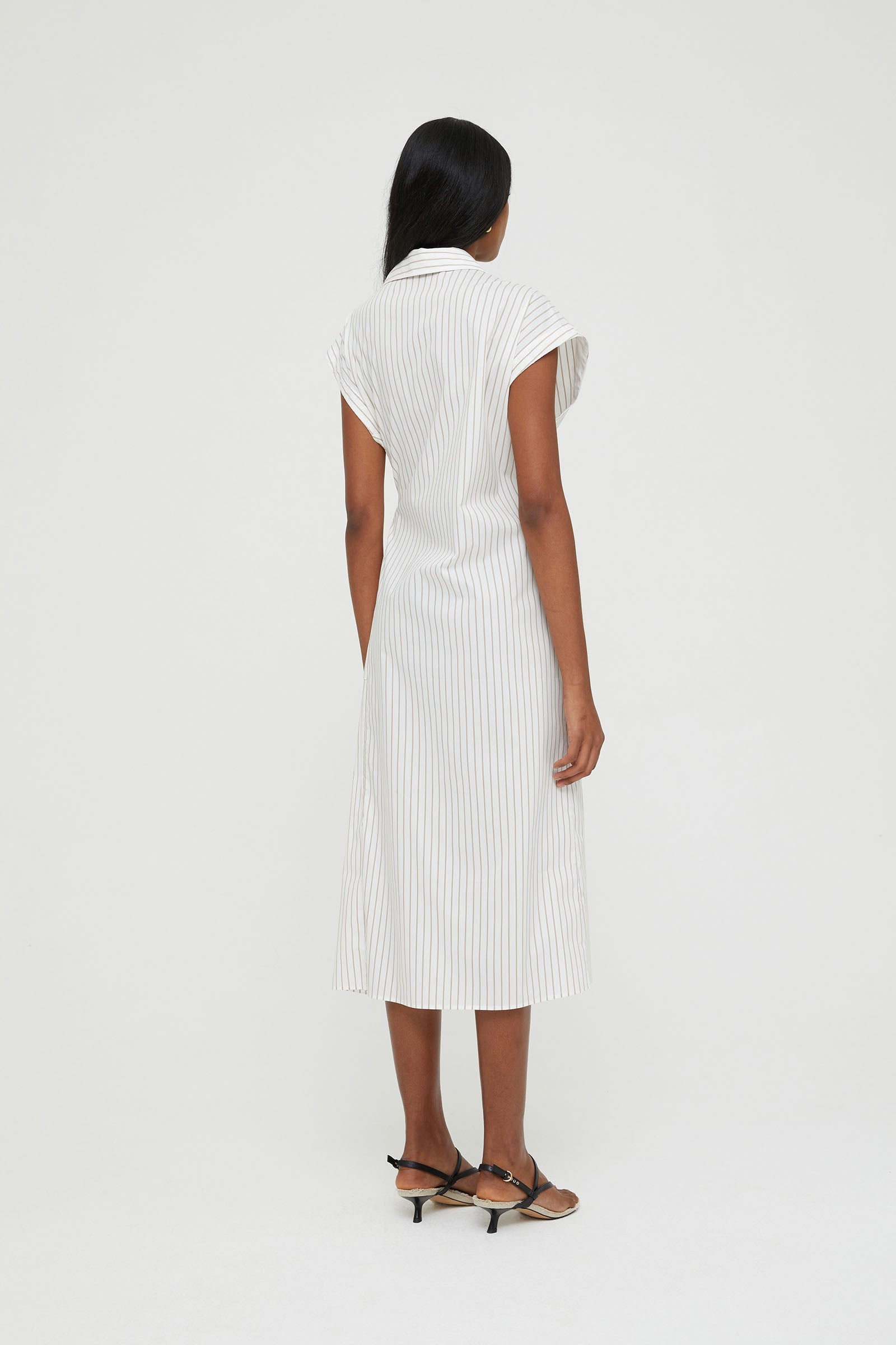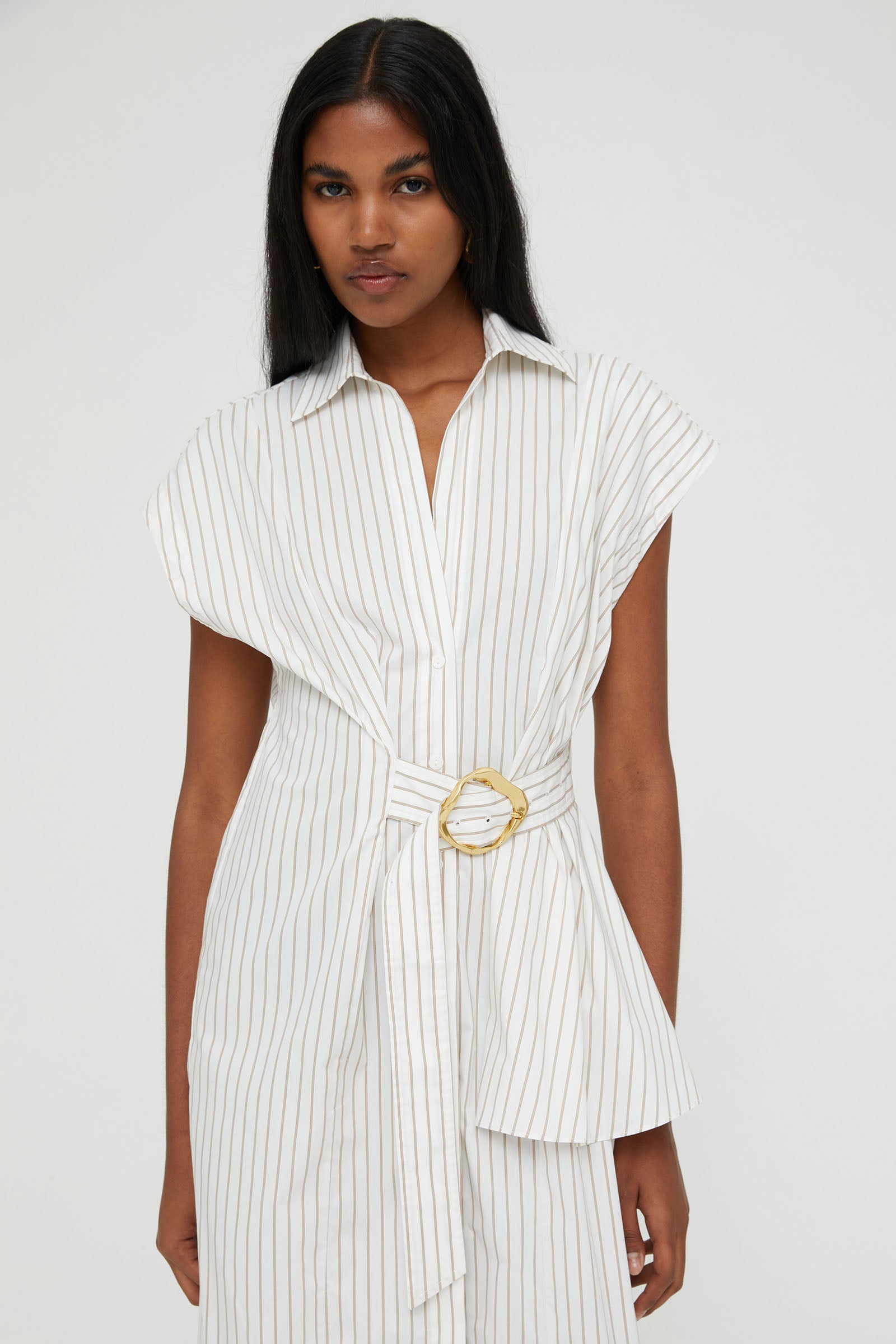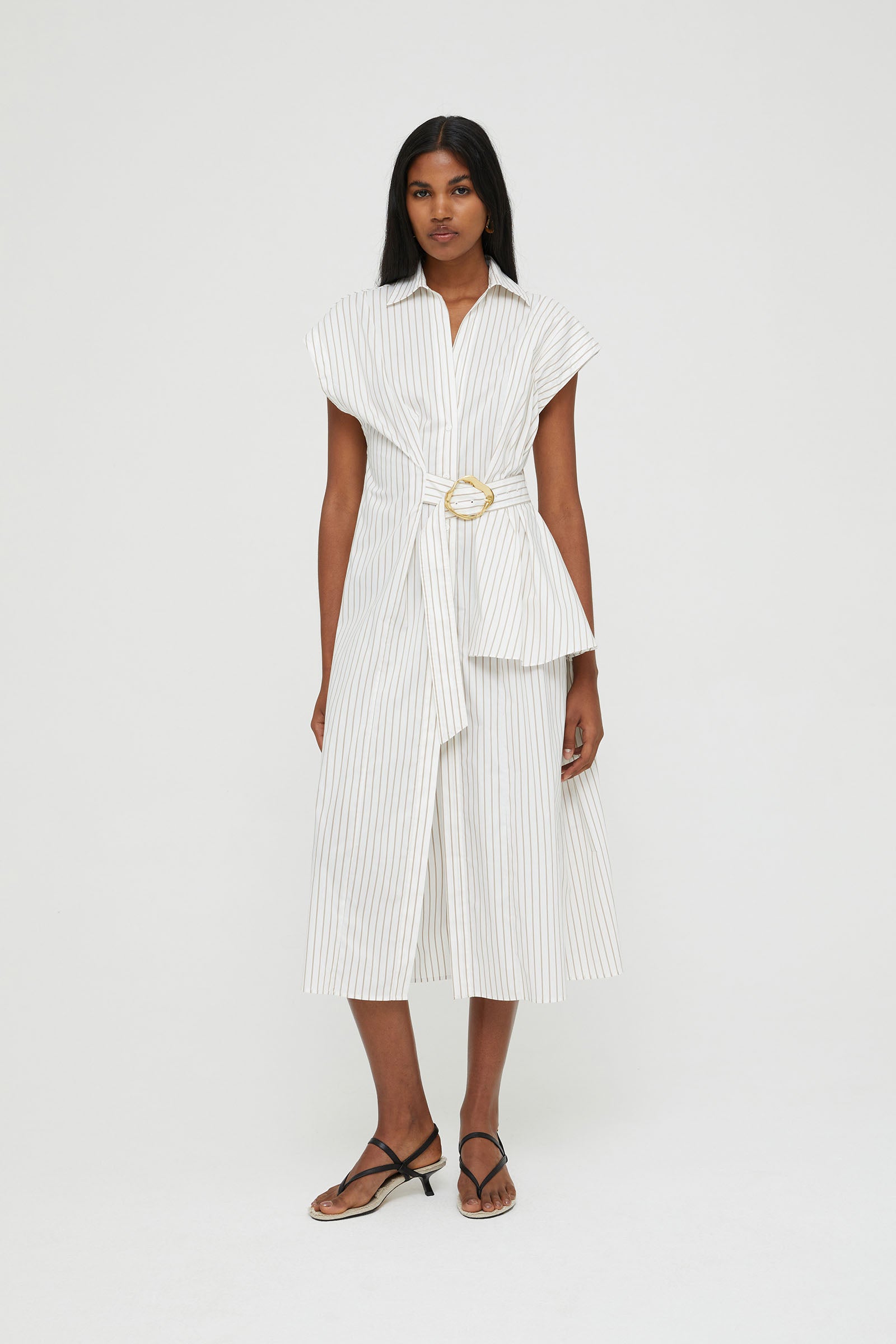 STRIPED POPLIN DRESS WITH BELT AND LARGE BUCKLE .