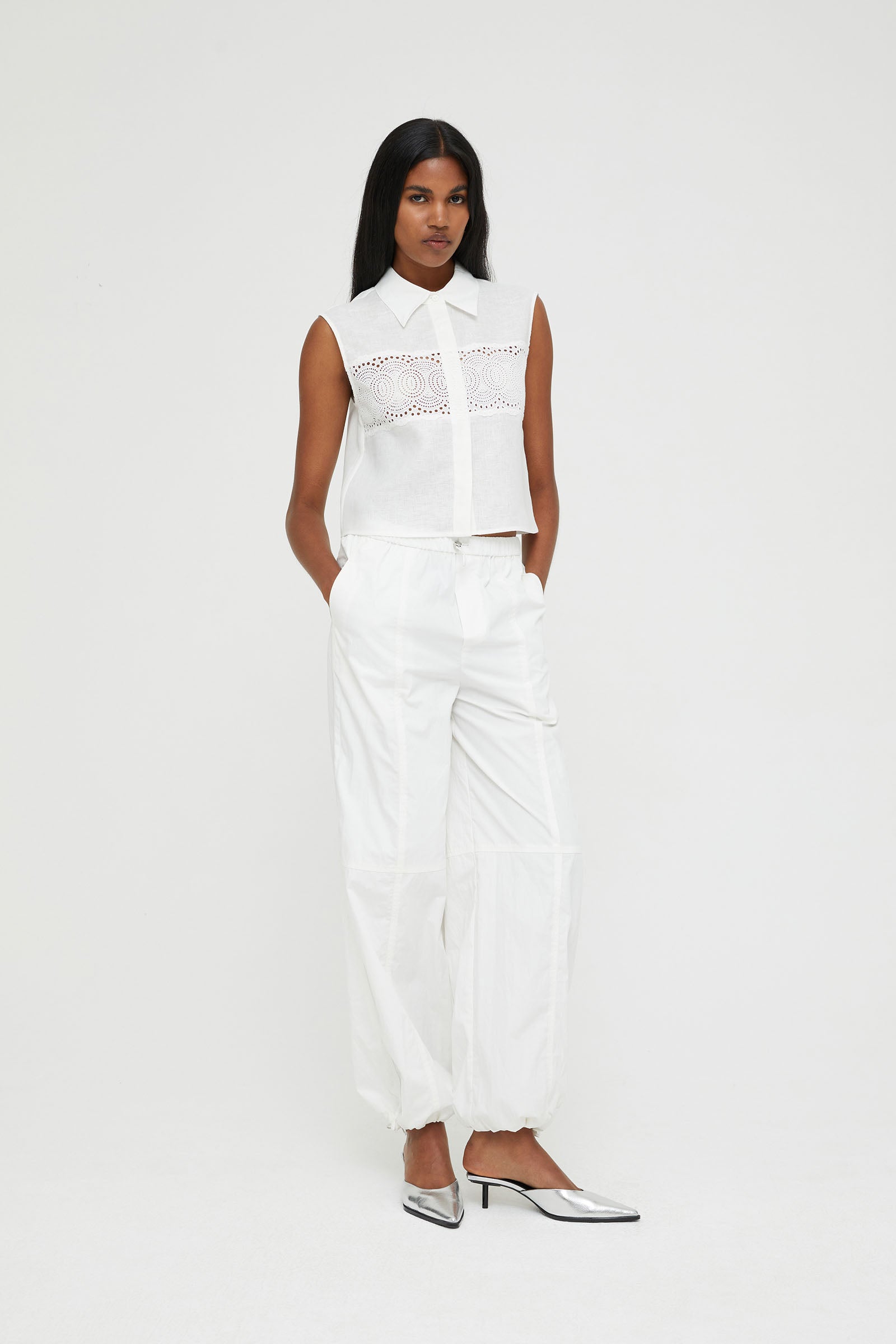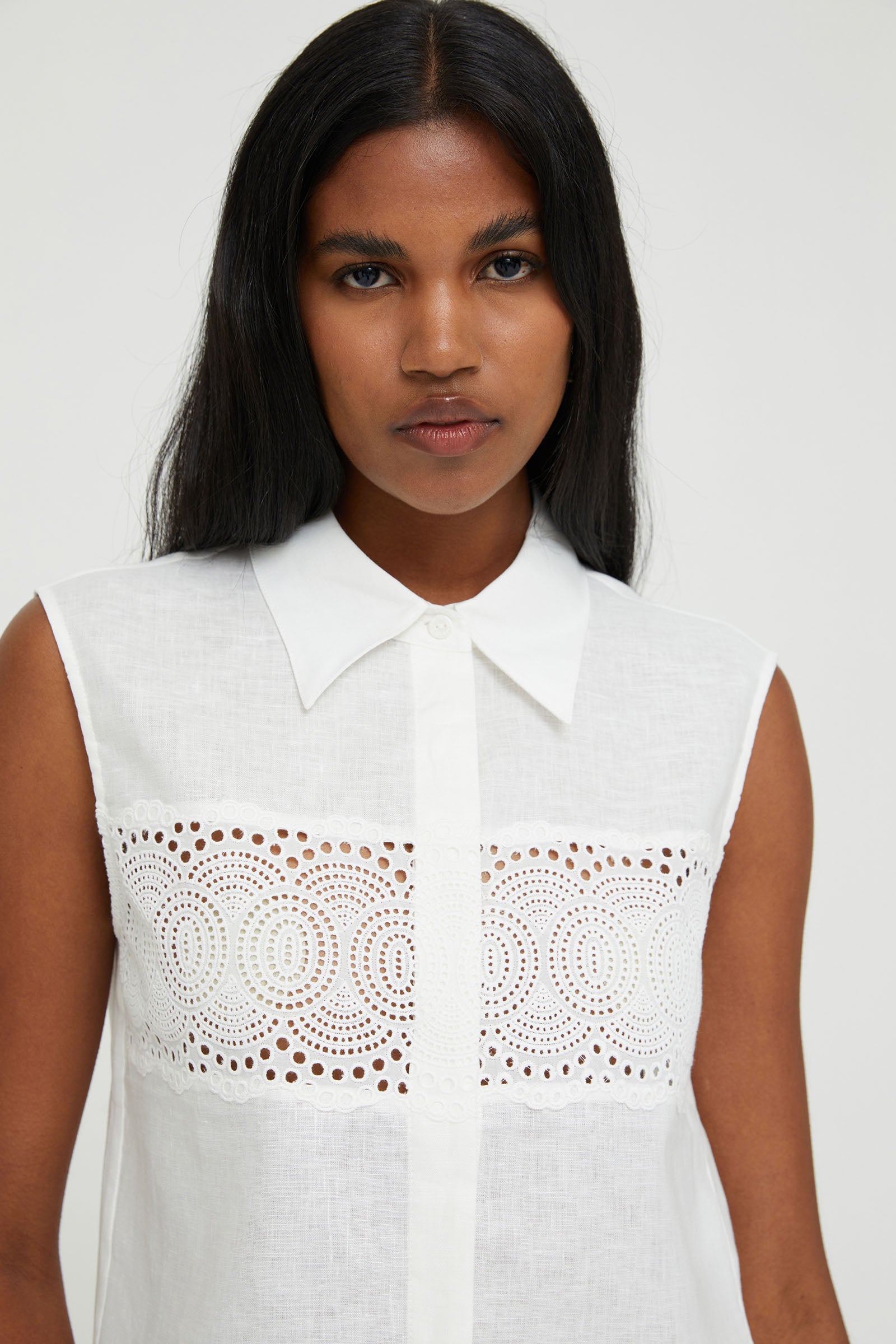 LINEN SLEEVELESS CHEMISIER WITH SANGALLO PASSAMANERIA INSERT .