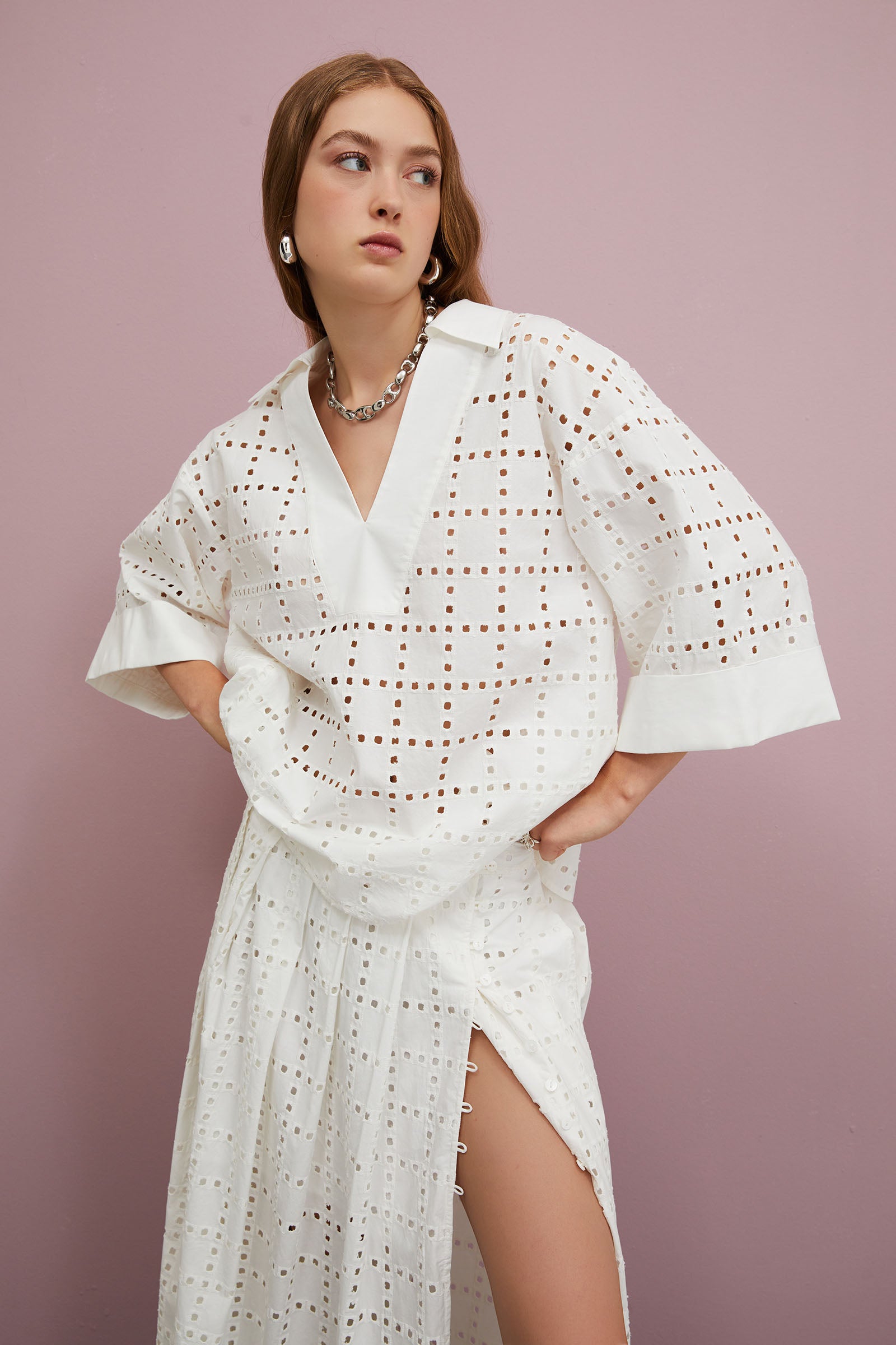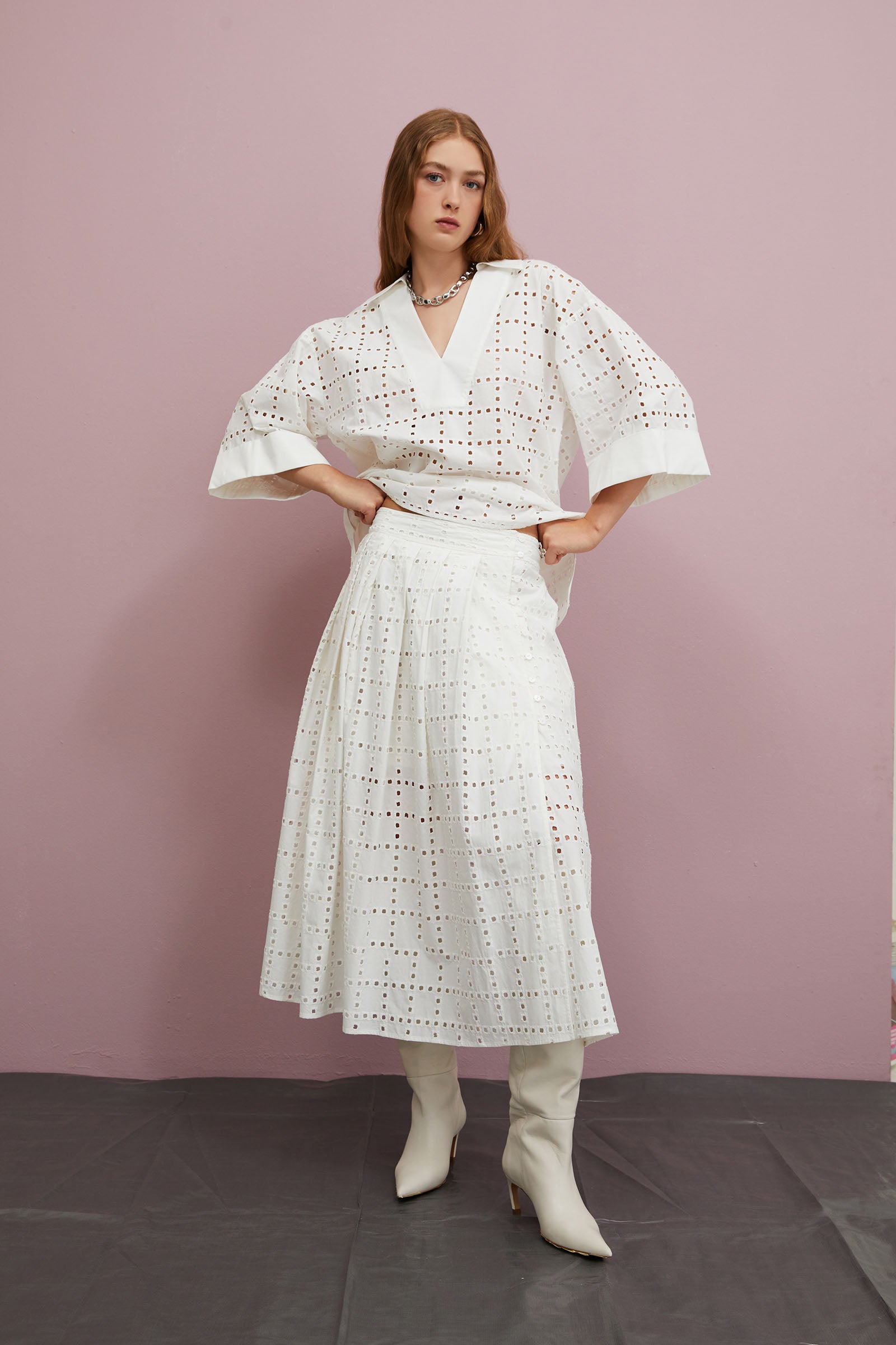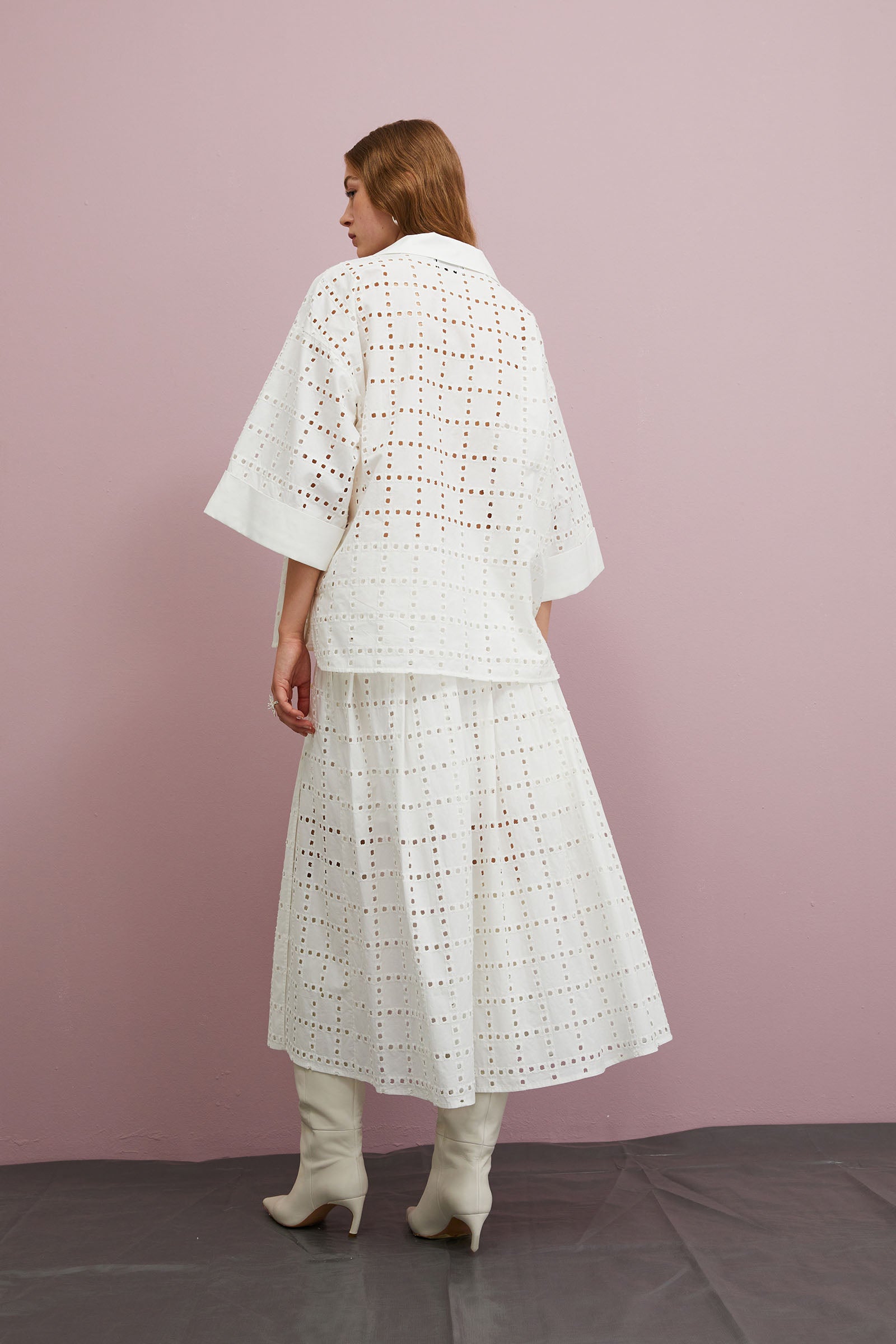 MACRO CHECKED BROWN LACE SKIRT WITH BUTTONS .