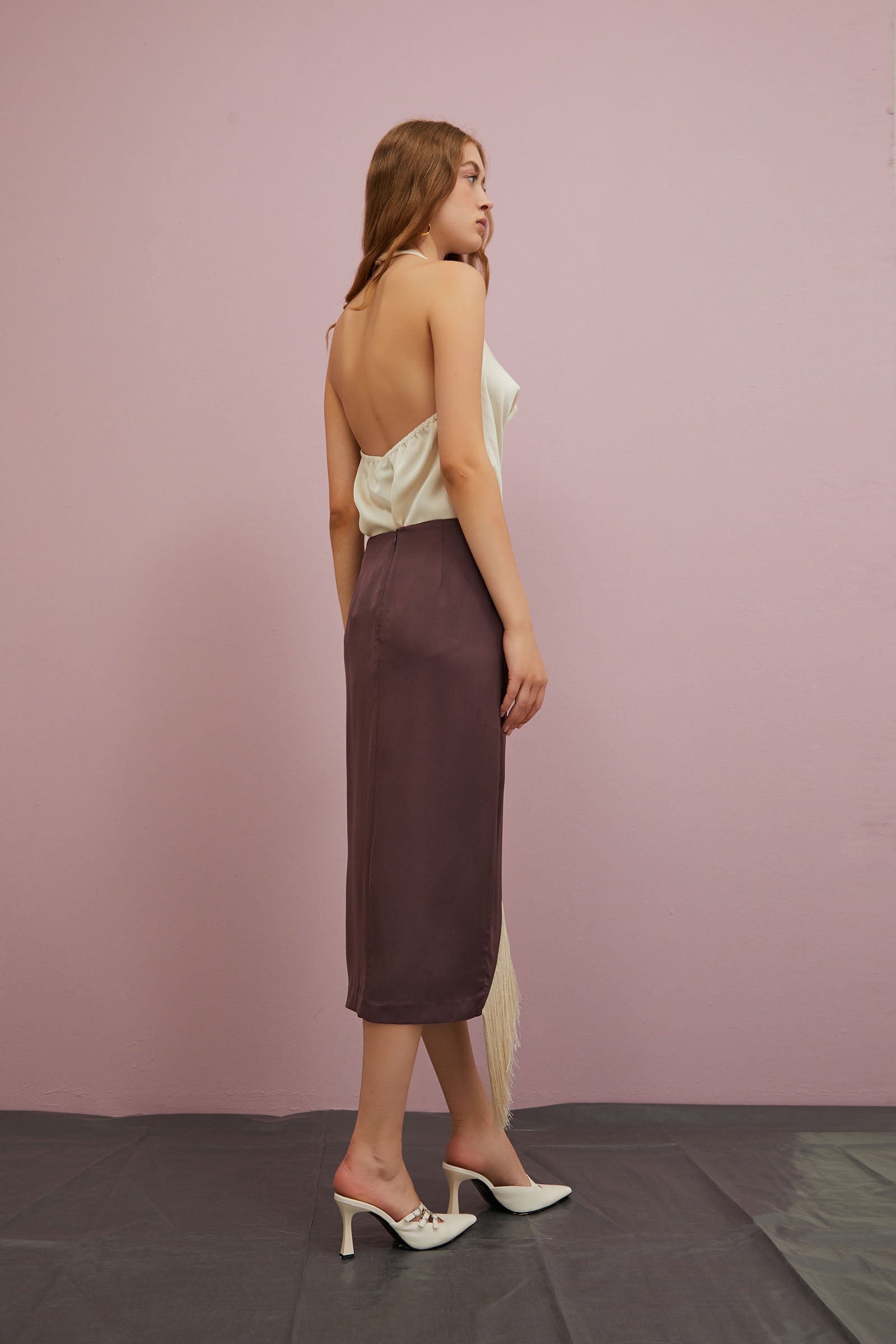 VISCOSE CREPE SKIRT WITH FRINGE INSERT ON THE FRONT .
