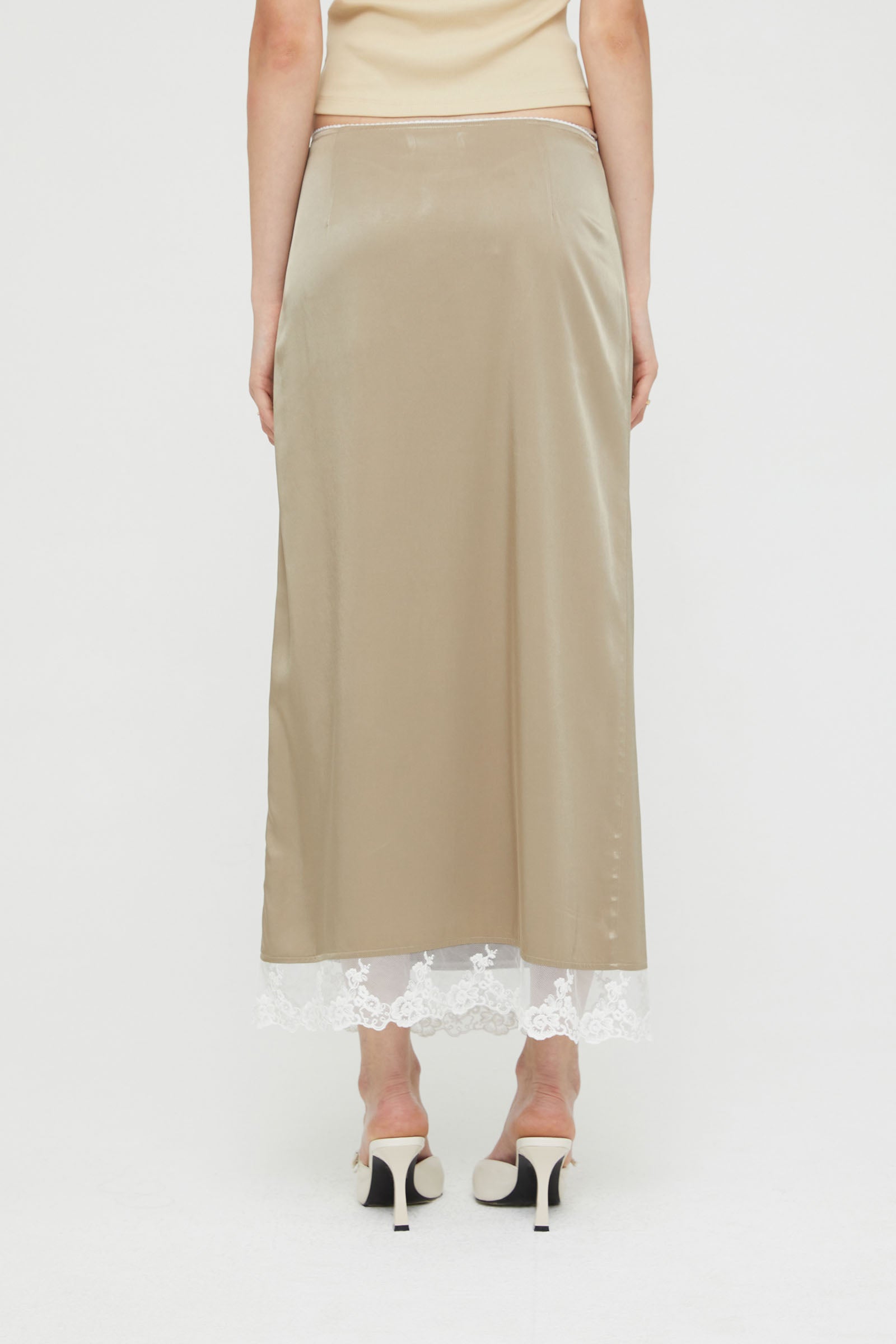 VISCOSE SATIN SKIRT WITH LACE INSERT AT THE BOTTOM .