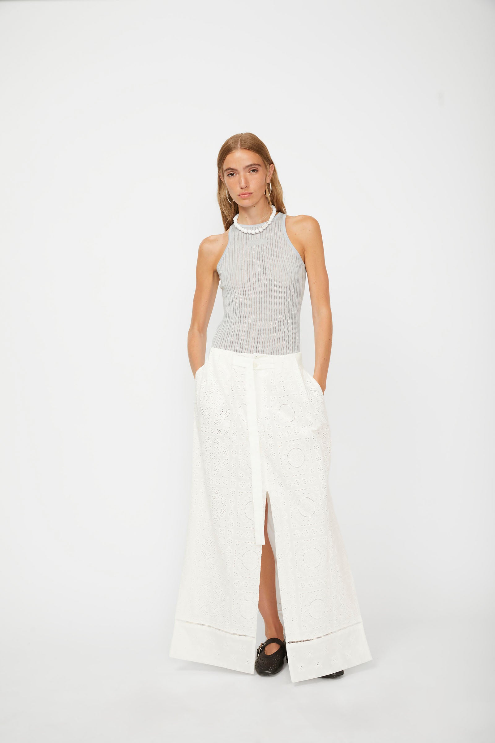 LONG SKIRT WITH SLITS WITH BRODERIE ANGLAISE PATCH.