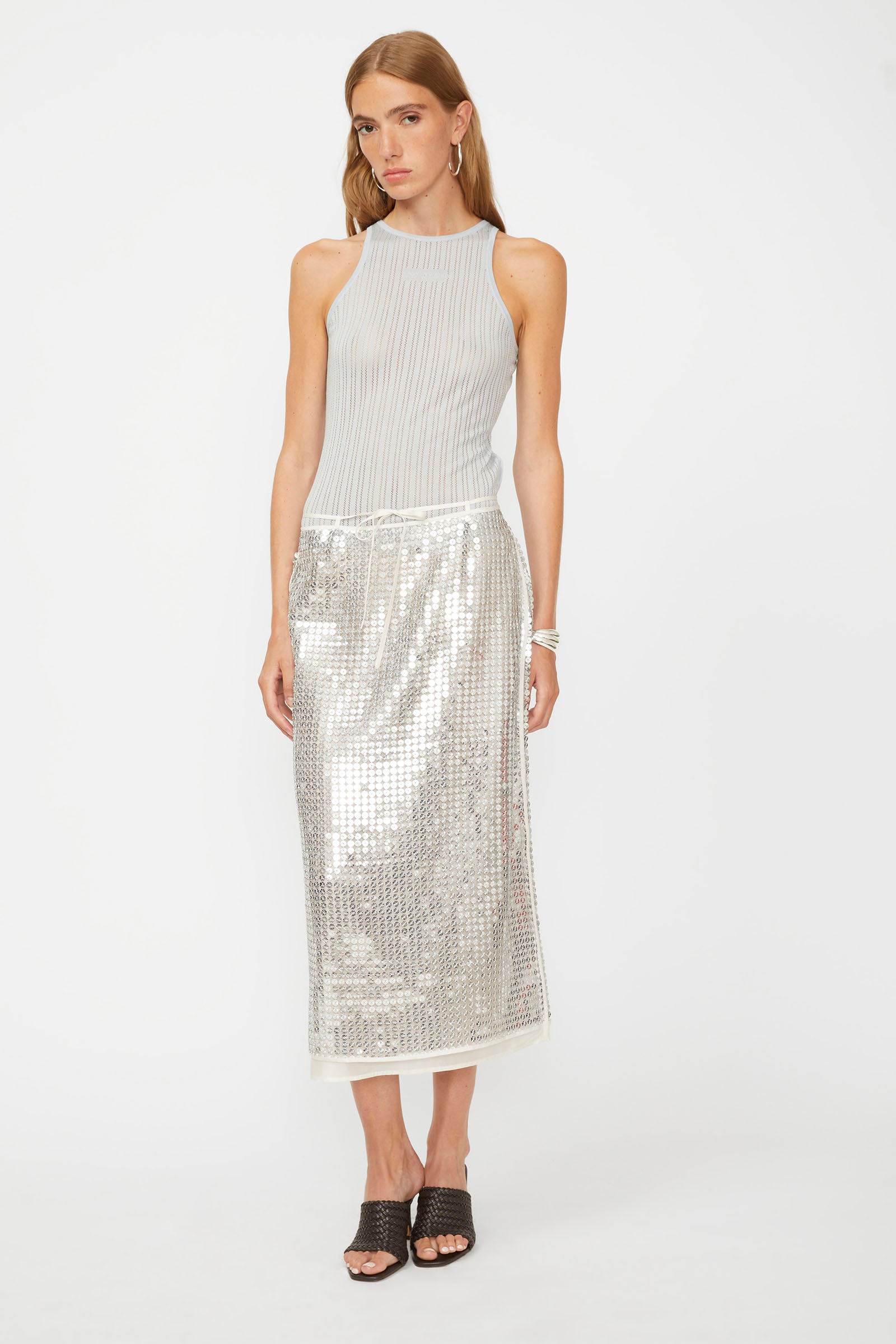 SEQUINED MIDI SKIRT WITH WAIST STRAP DETAIL.