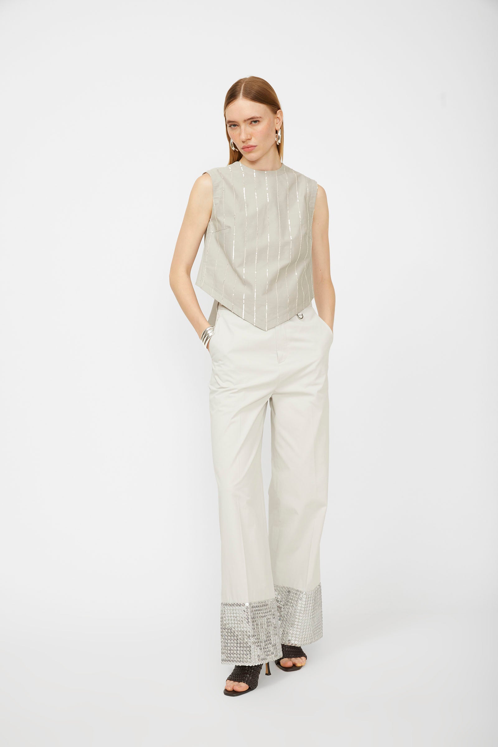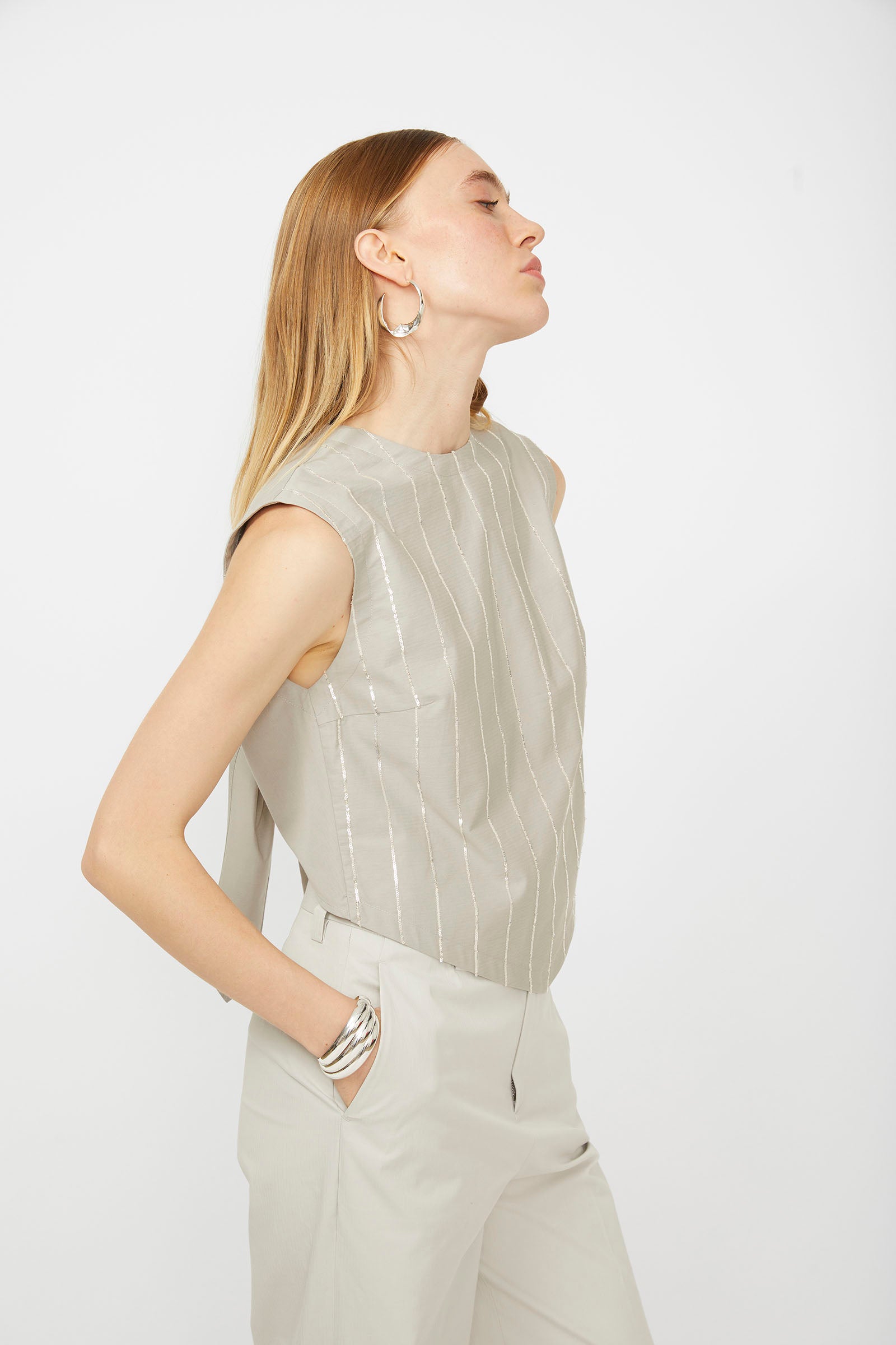 COTTON TOP WITH SEQUINED EMBROIDERY STRIPED ON THE FRONT AND BACK KNOT.